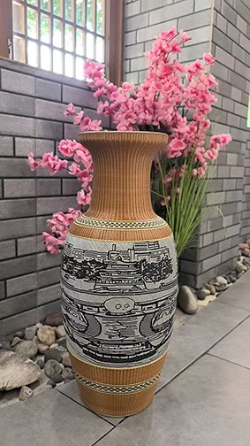 据笔者在小红桥竹编专合社荣誉榜上看到,2014年,小红桥竹专合社发明生产的"活鸡笼"(专利号:2013305390984),鸡蛋篮(专利号:2013305389775)获专利。从2014年起,万登贵协助市县就业部门开展10余期竹编工艺培训并担任培训教师,共培训学员400名,2019年6月在专合社所在地长宁县富兴乡小红桥街道成立宜宾市级大师工作室。2019年3月被聘为宜宾学院竹编工作室竹编教师,特别可喜是,《熊猫戏竹》2018年被评为宜宾市特色旅游商品,平面竹编作品《隐形观音》《熊猫戏竹》被四川省乡村旅游协会评为四川省农村手工艺优秀作品奖《编织类》,磁胎作品《中国李庄》荣获2019年第三届四川省农村手工艺大师优秀作品奖。另有屏山县四季果园竹建筑群,锦屏山接待大厅,记忆公园门楼,自贡恐龙博物馆大型竹编树灯群等竹建代表产品。万登贵创新开发的平面竹编画,立体竹编,瓷胎竹编等工艺,推动竹编从实用品转向艺术品。其作品《熊猫戏竹图》被选为世界竹藤组织纪念品,并多次获省级奖项。万登贵还积极融合文旅产业,开设竹编体验课超2万人次,在宜宾学院等地培训学员千余人,获四川省劳动模范""翠屏区古都工匠"等荣誉,她以竹编技艺助力乡村振兴。