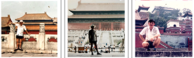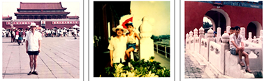 图(1):儿子和侄女在故宫内的留影;图(2):我夫人(戴白色布帽)手抱外国小朋友、儿子、侄女和外国小女孩在故宫内的留影;图(3):我在故宫内的留影。