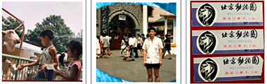 图(1):儿子和侄女在北京动物园喂动物;图(2):我在北京动物园门口的留影;图(3):进入北京动物园的门票1元/人。