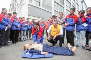 2023年11月10日,四川省广安市华蓥山经开区大千电子科技有限公司的务工人员在体验应急救助,提升工伤预防技能。
