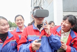 2023年11月10日,四川省广安市华蓥山经开区大千电子科技有限公司的务工人员,通过VR体验模拟的安全事故,提升工伤预防技能。