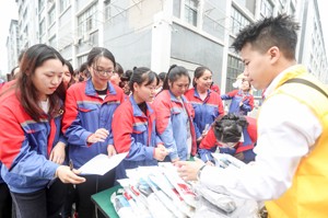 2023年11月10日,四川省广安市华蓥山经开区大千电子科技有限公司的务工人员,在领取该市社会保险局免费发放的劳动安全防护用品。(邱海鹰)