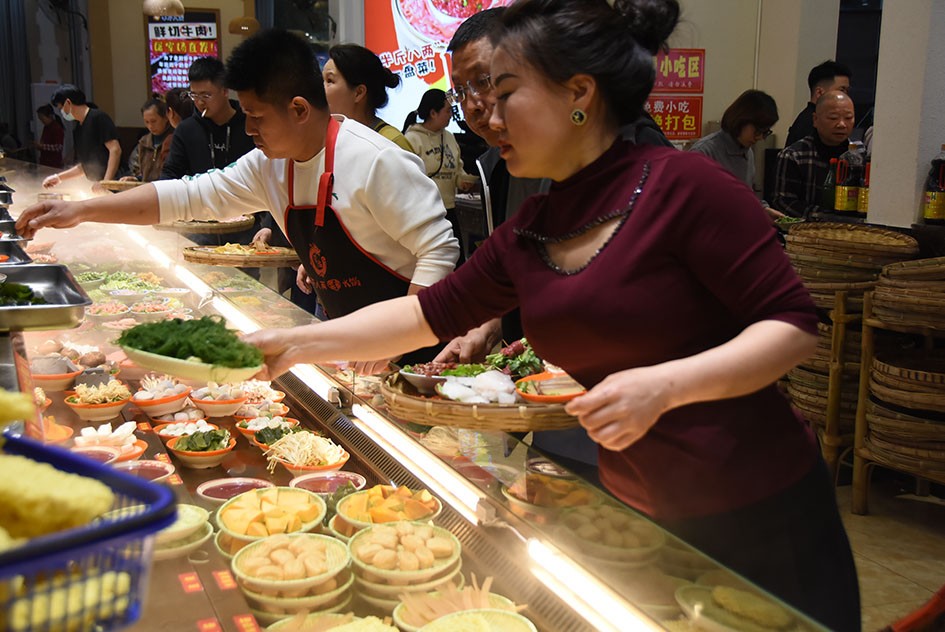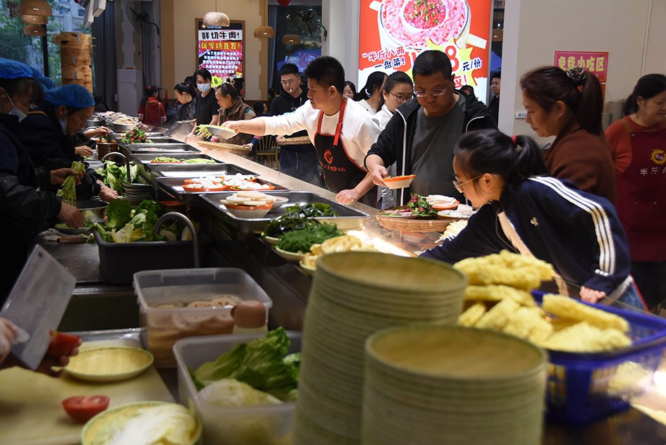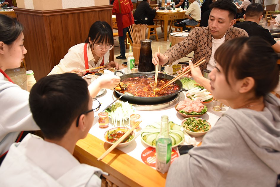 没过一会儿,李苗和朋友端着满满三簸箕牛肉、鸭肠、黄喉等菜品回到座位,服务员已经把锅底烧得滚开,浓郁的麻辣香气扑面而来。席间,一位中年服务员大姐不停地穿梭在各个餐桌之间,为客人添茶倒酒、更换餐盘,脸上始终挂着热情的笑容。李苗说:“我就喜欢这儿的氛围,服务员大姐们都特别实在,让人感觉很亲切。”
