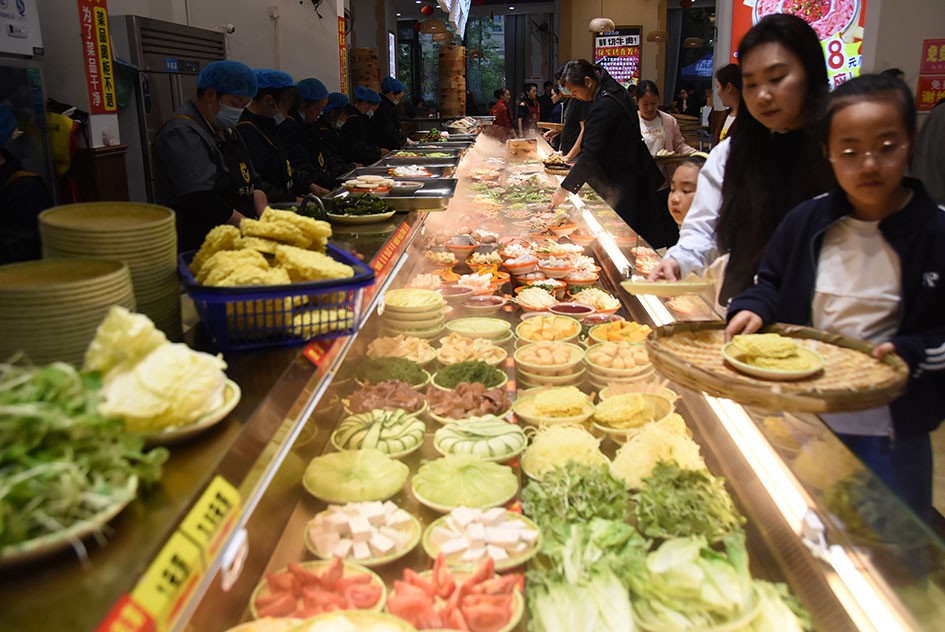 跟着邱经理穿过人声鼎沸的大厅,李苗一行在靠边的空桌坐下。刚坐稳,李苗就拿起一个小簸箕,拉着两个朋友直奔冷柜。“今晚我做东,你们别跟我客气!”她一边笑着说,一边从招牌菜“半斤八两”开始,一口气拿了15份19.8元的“贵价菜”,才让朋友去拿配菜。在旁边桌吃饭的客人见状,也纷纷点头:“这儿的菜实在,价格也亲民,请客吃饭一点压力都没有。”